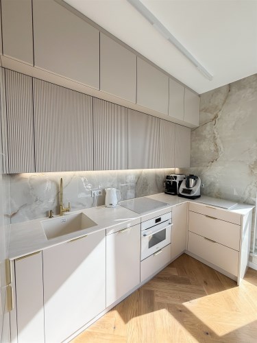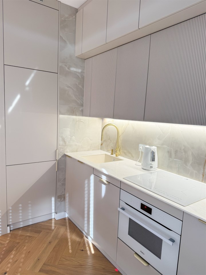 wysokiej klasy zabudowa na wymiar, lodówka w zabudowie marki SAMSUNG, piekarnik z funkcją mikrofalą marki AMICA, zmywarka w zabudowie 45 cm marki BOSCH, płyta indukcyjna ELECTROLUX (wszystko w cenie mieszkania).