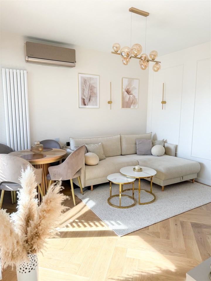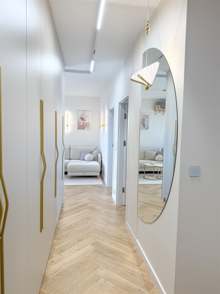 deska BARLINEK) ułożone w modną jodełkę. Całe lokum rozświetlają nowoczesne i unikatowe lampy.