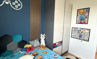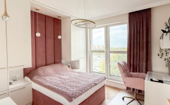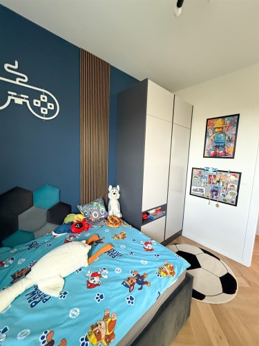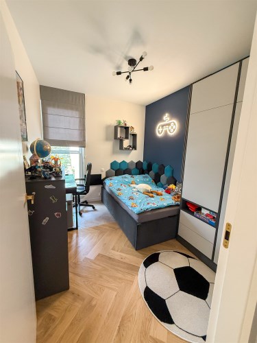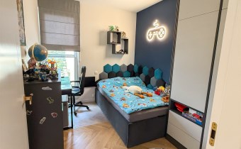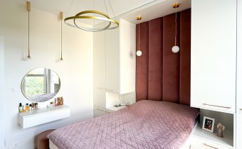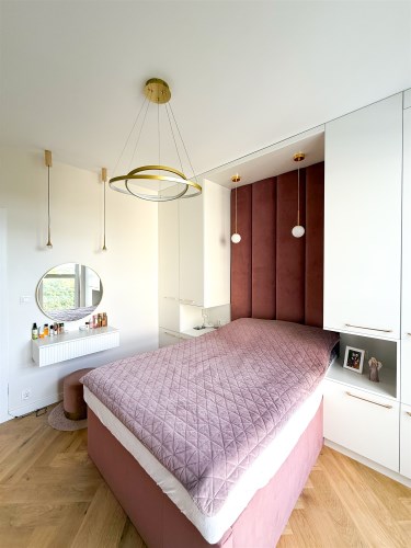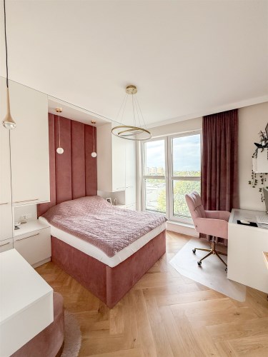 Sypialnia została zabudowana szafami oraz dużym wygodnym łóżkiem. W sypialni znajduje się również biurko jak i toaletka