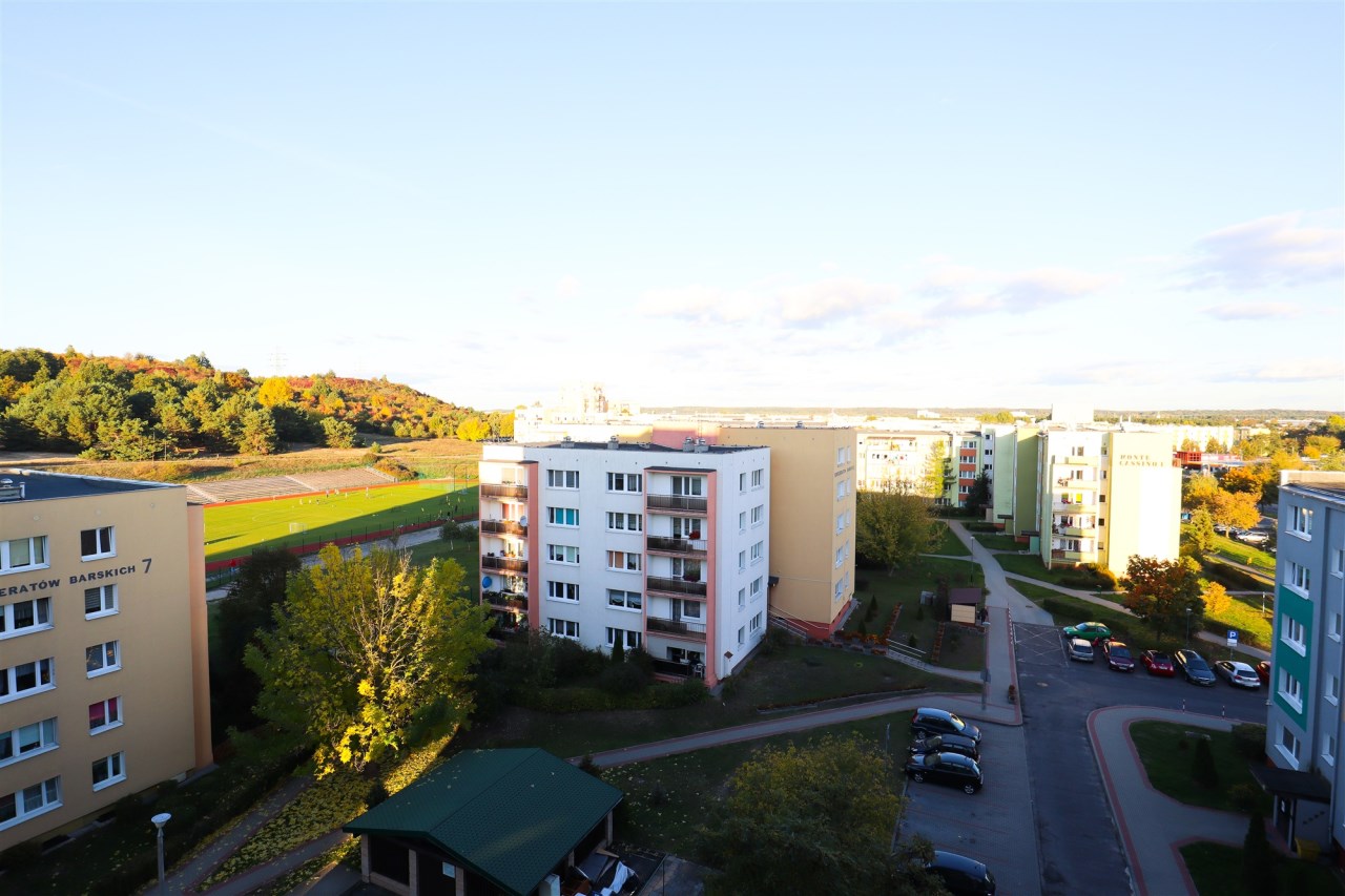 Konfederatów Barskich. Lokal usytuowany jest na 6. piętrze 7-piętrowego bloku mieszkalnego z 1988 roku, wykonanego z wielkiej płyty. Mieszkanie posiada pełną własność, a potencjalny właściciel nabywa dodatkowo piwnicę oraz komórkę lokatorską na półpiętrze, oba pomieszczenia wpisane na księgę wieczystą.