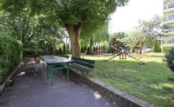 Teren wokół budynku jest pięknie zagospodarowany z doskonałym placem zabaw.
