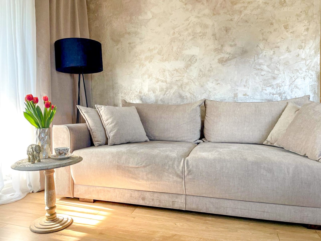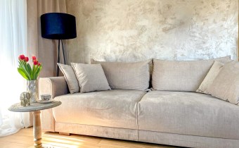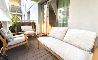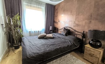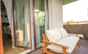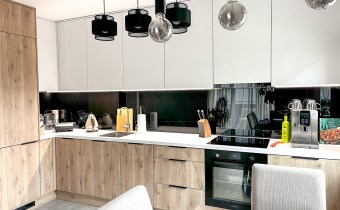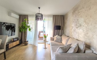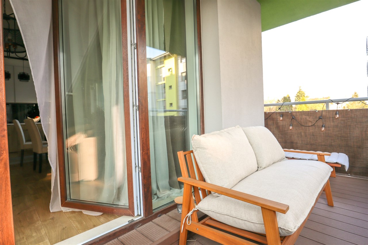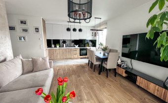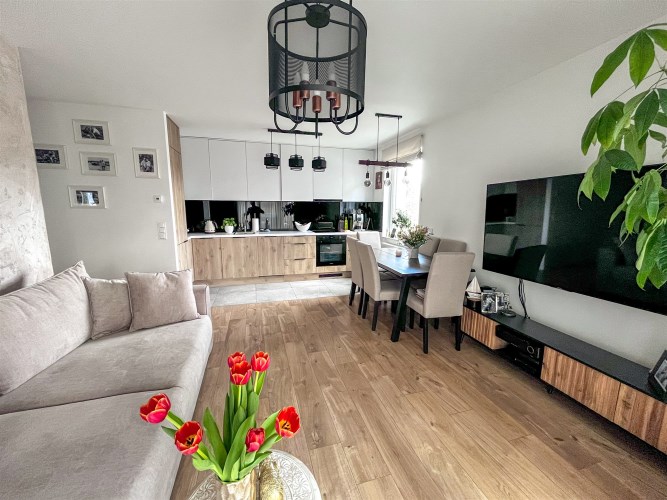 Sercem tego apartamentu jest przestronny salon połączony z aneksem kuchennym, o łącznej powierzchni 22,70 m². W klimatycznym wnętrzu pozostaje kompleksowa zabudowa kuchenna oraz nowoczesne sprzęty AGD, co sprawia, że od razu można korzystać z komfortu nowego domu. Z salony prowadzi wyjście na wyjątkowy