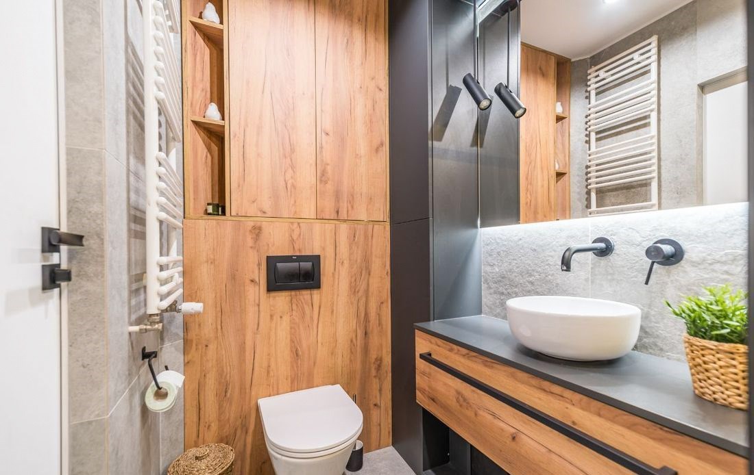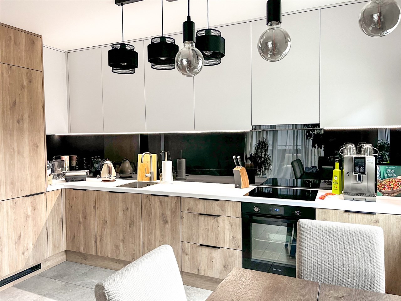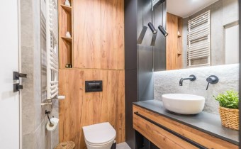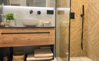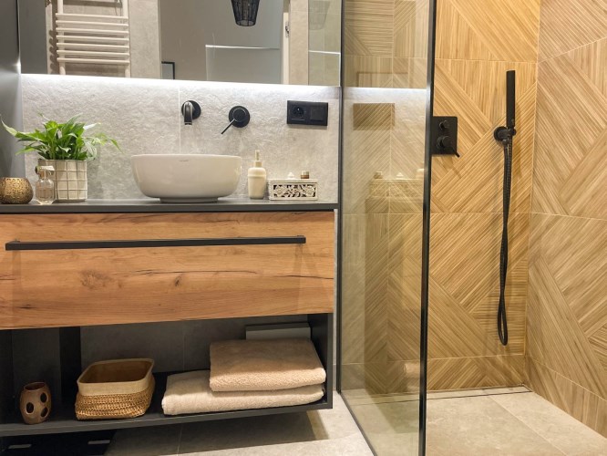 nowoczesny charakter apartamentu. Przestronny prysznic typu walk-in oraz elegancka drewniana zabudowa z wbudowaną armaturą to detale, które zachwycą nawet najbardziej wymagających. Dodatkowo, w przedpokoju znajdują się funkcjonalne rozwiązania, takie jak