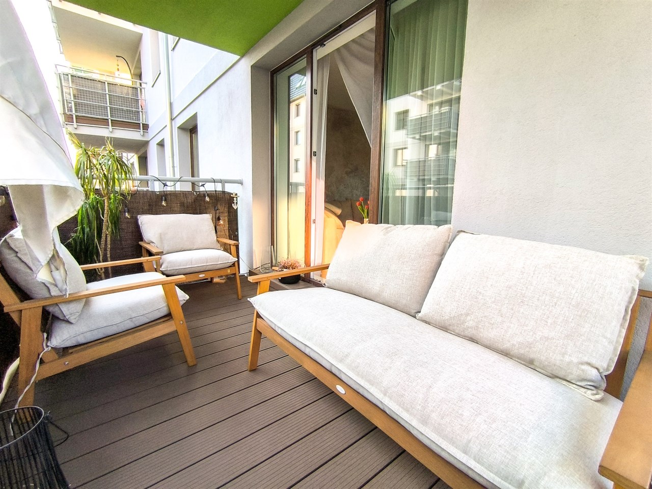 taras w kształcie litery L o powierzchni 10,5 m², idealny do porannych kaw czy wieczornych spotkań z przyjaciółmi – zapewniający panoramiczny widok na wschód.